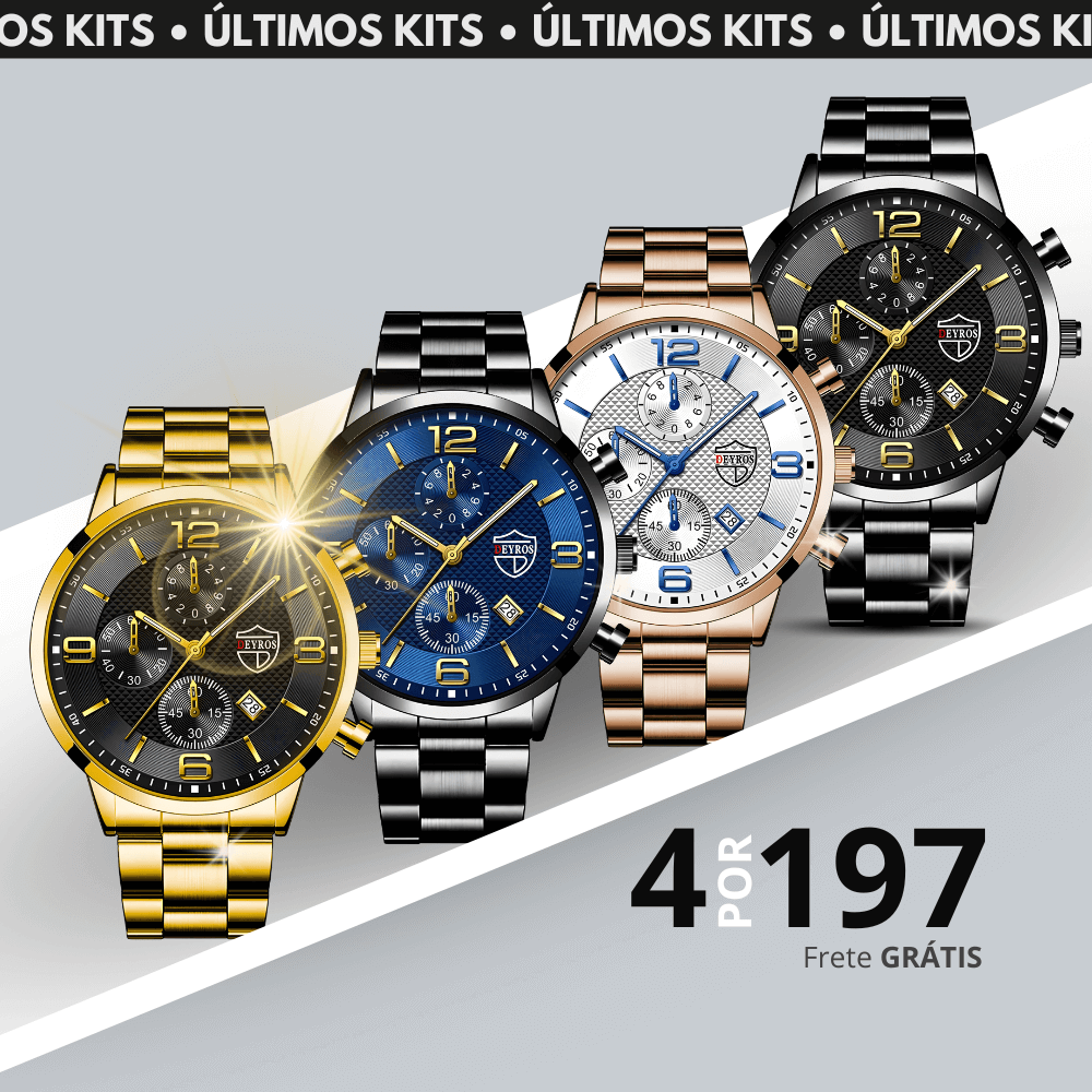 Kit BOX com os 4 relógios Premium℗ a prova d'água, com ponteiros funcionais de hora, minutos e segundos e calendário automático. Este é o Relógio de aço resiste a pancadas e é durável.